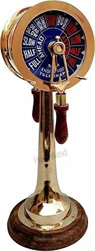 United Sound Both Décor Bell Side Telegraph Nautisch Messing Antiek Maritiem Schip 14 Vintage Astrolabe Marine. De Telegraph is handgemaakt en bestaat uit de beste kwaliteit grondstoffen, d.w.z., messing, gekruid hout en kunststof materiaal. De hendel van de telegraaf heeft houten uiteinden en ze maken belgeluid wanneer ze worden bewogen of gedraaid. Materiaal: Messing & Houten Afwerking: Glanzend Messing Afmetingen: 14 inch Ca. Een motorordertelegraaf of E.O.T., vaak ook Chadbourn, is een communicatieapparaat dat wordt gebruikt op een schip (of onderzeeër) voor de piloot op de brug om ingenieurs in de machinekamer te bestellen om het schip op een bepaalde gewenste snelheid van stroom te voorzien. In vroege schepen, van de 19e eeuw tot ongeveer 1950, bestond het apparaat meestal uit een ronde wijzerplaat van ongeveer negen inch (~ 20 centimeter) in diameter met een knop in het midden bevestigd aan een of meer handgrepen, en een indicatoraanwijzer op het gezicht van de wijzerplaat. Er zou ook een revolutie per minuut indicator zijn, gewerkt door een handslinger. Moderne E.O.T.s op schepen die ze nog steeds gebruiken, gebruiken elektronische licht- en geluidssignalen. Operatie Traditionele E.O.T.s vereiste een piloot die snelheid wilde veranderen om de Telegraph op de brug te “ringen”, het verplaatsen van de hendel naar een andere positie op de wijzerplaat. Dit zou een bel in de machinekamer bellen en hun aanwijzer naar de positie op de wijzerplaat verplaatsen die door de brug is geselecteerd. De ingenieurs horen de bel en verplaatsen hun handvat naar dezelfde positie om hun bevestiging van de bestelling aan te geven en het motortoerental dienovereenkomstig aan te passen. Een dergelijke bestelling wordt een “bel” genoemd, bijvoorbeeld de volgorde voor de maximale snelheid van een schip, flanksnelheid, wordt een “flankbel genoemd.