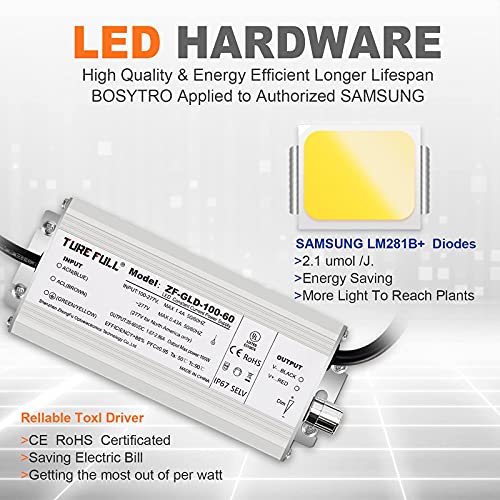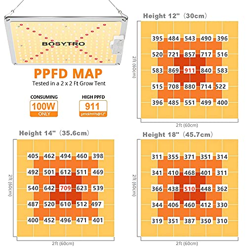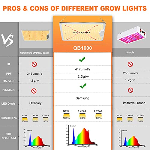 🌿1【More Energy Efficient Better Effect】Using the Newest high-yield LED technology-234 pcs Samsung LM281B+ diodes. So QB1000 LED Grow Lights achieves a high energy efficiency of 417 umol/s and improves the light transmittance. The LED Growing Lights consumes only 100Watt of power, which is 50% less than the operating power of other 200W HID/Blurple/HPS lamps, while help gets 50% higher yield harvest. The maximum output is 2.3g/w. The Max effective coverage is 3×3 ft. Veg Coverage: 2×2 ft