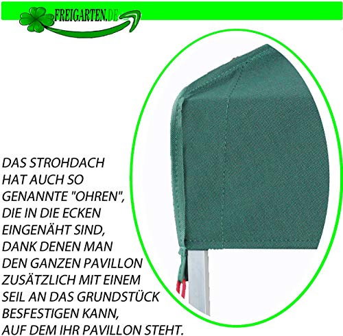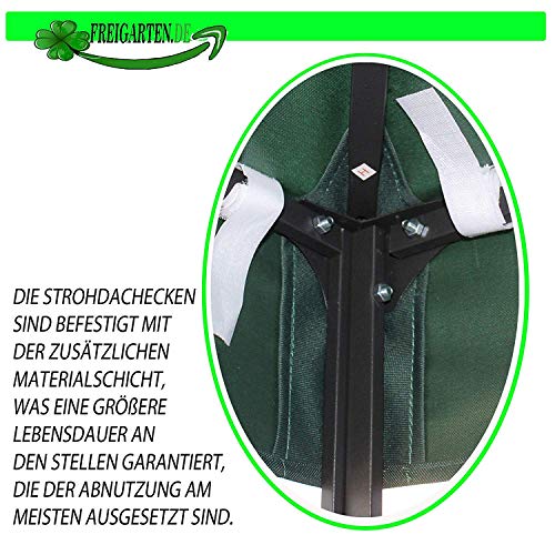 Het dak heeft een systeem van klittenbandsluitingen, waarmee je het dak eenvoudig aan de paviljoenconstructie kunt bevestigen. Het rieten dak heeft ook zogenaamde “oren”, die in de hoeken zijn ingenaaid, waardoor je het hele paviljoen bovendien met een touw aan het perceel kunt bevestigen waarop je paviljoen staat. De strodaken zijn bevestigd met de extra materiaallaag, wat een langere levensduur garandeert op plaatsen die het meest slijtage