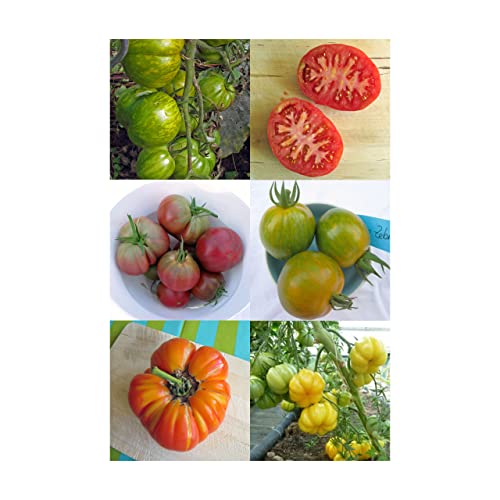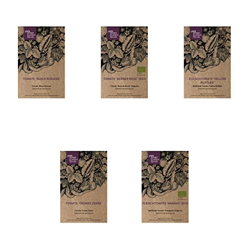 🌿 ZAAD Dit zaadset bevat (Solanum lycopersicum): saladetomaat ‘Berner roos’, gestreepte stoktomaat ‘Groene zebra’, zwart-rode vleestomaat ‘Black Russian’, oranje-gele vleestomaat ‘Ananas’ en gele vultomaat ‘Yellow Ruffled’